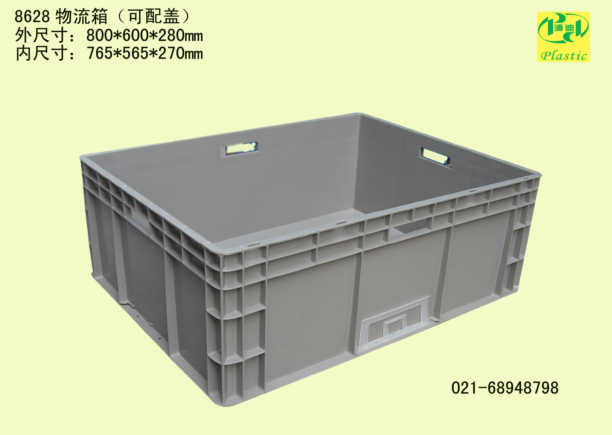 8628物流箱(可配盖) 外尺寸:800*600*280mm 内尺寸:765*565*270mm有效尺寸:750*550*270mm载重:单箱载重60KG,堆码承载≤400kg配置:配平盖和塑料卡夹片通用颜色为灰色,蓝色,可根据客户要求制作不同颜色产品。本产品广泛应用于汽车制造,汽车零配件行业,五金、机械、电子、化工、仪表、物流仓储等行业使用.