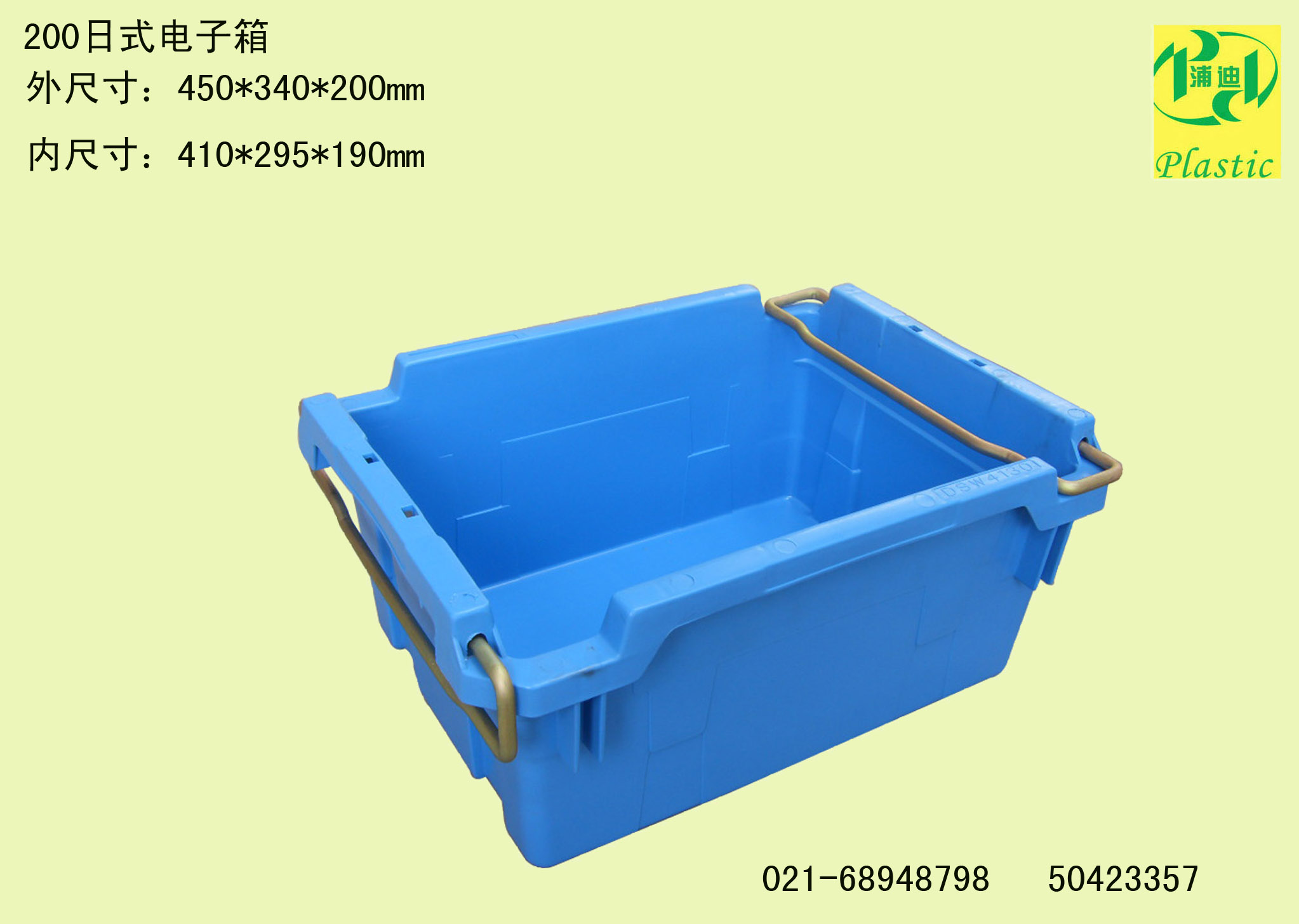 3号日式电子箱外尺寸:450*340*200mm内尺寸:410*295*190mm材质:共聚丙内容量:20L 承重:单箱承载≤ 20kg,堆码承载≤ 100kg.结构:可套可叠结构,两侧金属把手上翻,箱子可以相互叠加,空箱可以相互嵌套,空相套叠仅增高30mm,节省3/4运输储存空间.该产品多用于日资,日系企业.