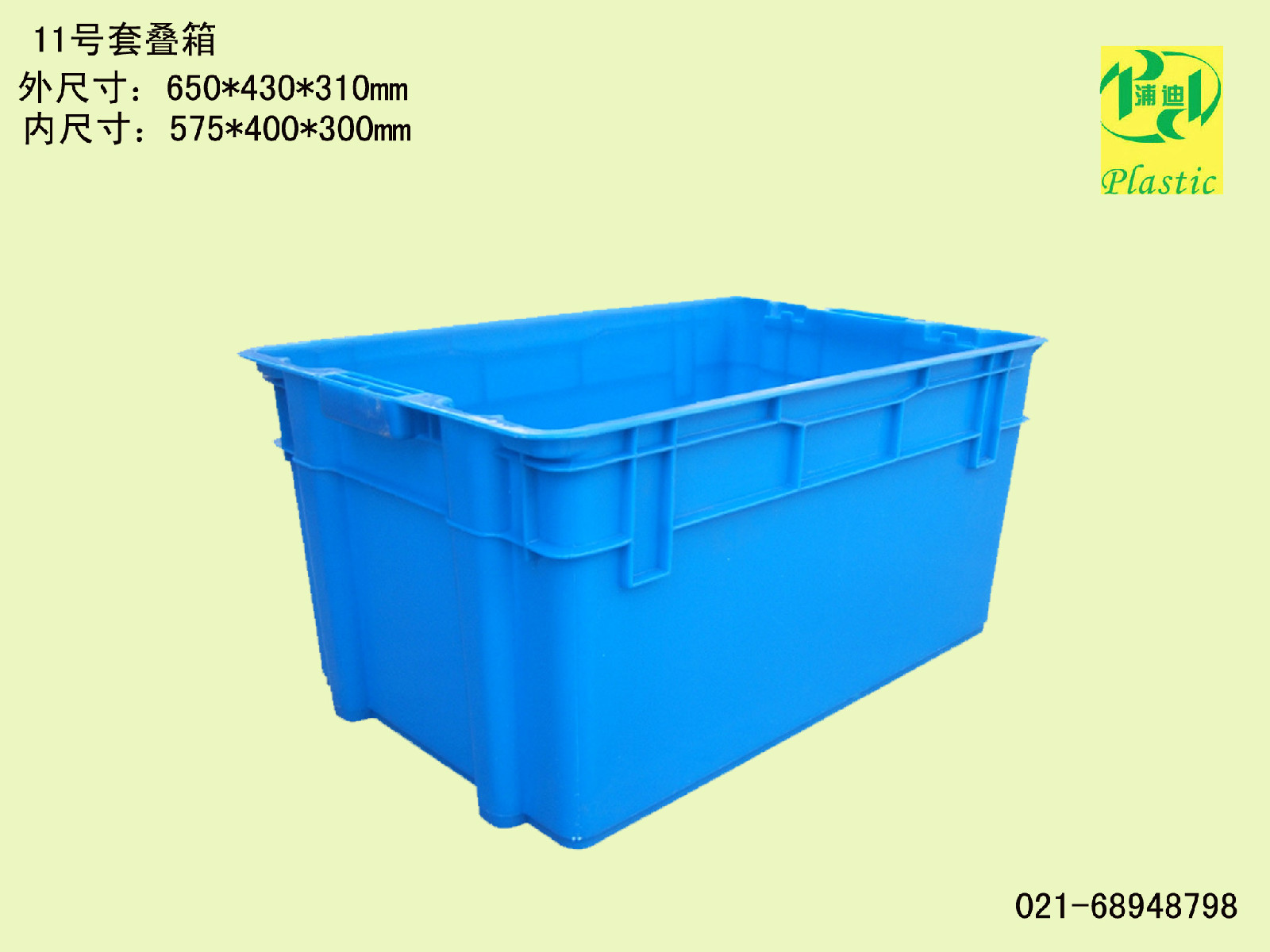 11号套叠箱外尺寸:650*430*310mm内尺寸:575*400*300mm材质:HDPE及部分高抗材料.内容量:65L 承重:单箱承载≤ 40kg、堆码承载≤ 180kg.结构:可套可叠,空箱可以相互嵌套,空相套叠仅增高8mm,节省3/4运输储存空间,满载状态180度反转可以相互叠加.